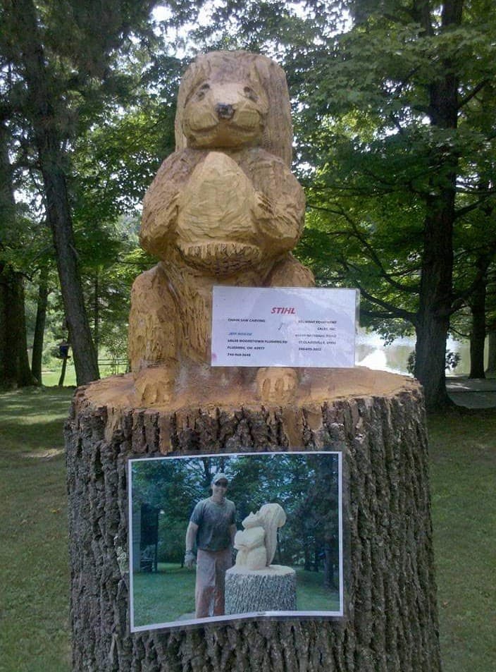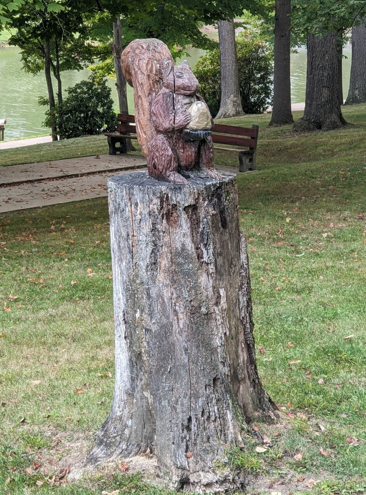 The squirrel was carved due to the amount of resident squirrels within the park grounds. If you walk through the park in Autumn, you may notice pings and cracks throughout which are the sounds of acorns falling on the vintage cottage tin roofs, a beautiful auditory reminder of the presence of many squirrels.